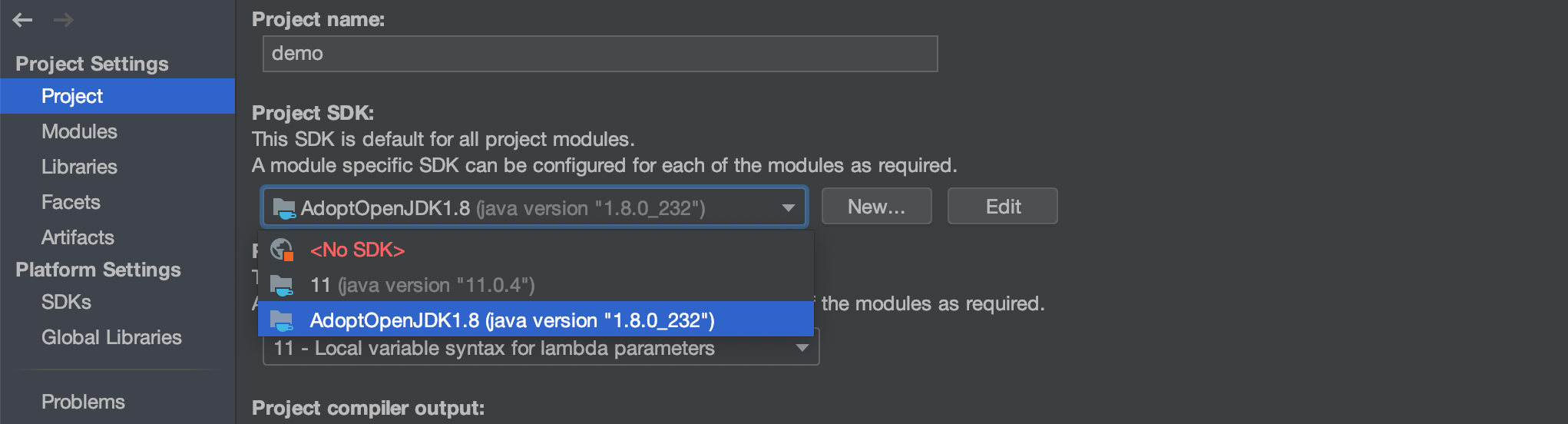 JDK 설정을 완료한 뒤 위에서 설정한 JDK로 Project SDK를 변경합니다.