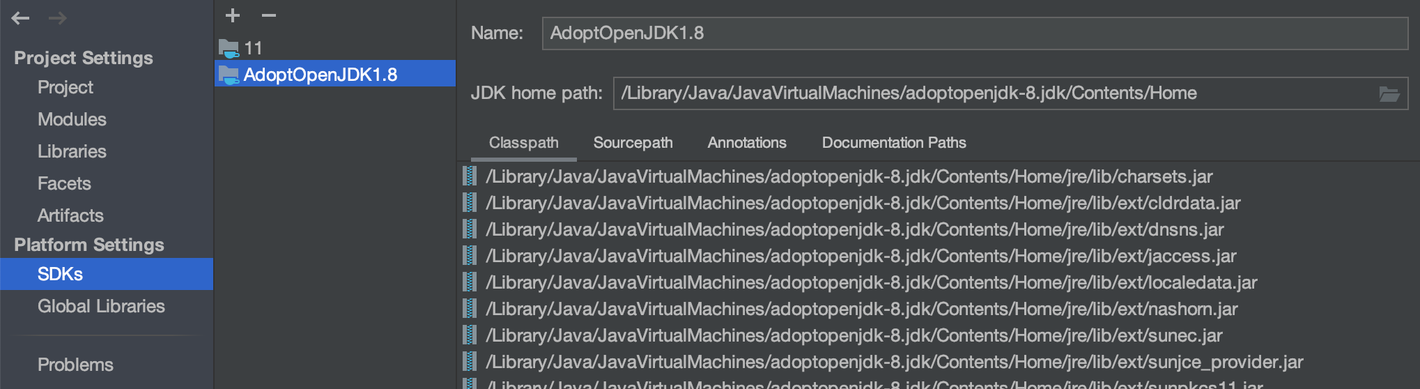 우선 Intellij를 실행하고 ⌘ + ; 를 눌러서 새로운 JDK 경로를 설정합니다.