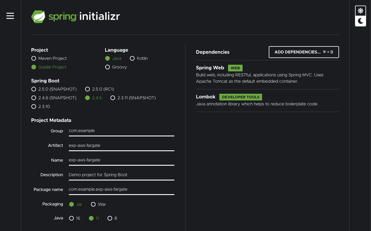 dependencies는 Spring Web과 Lombok(선택)을 추가해주세요.