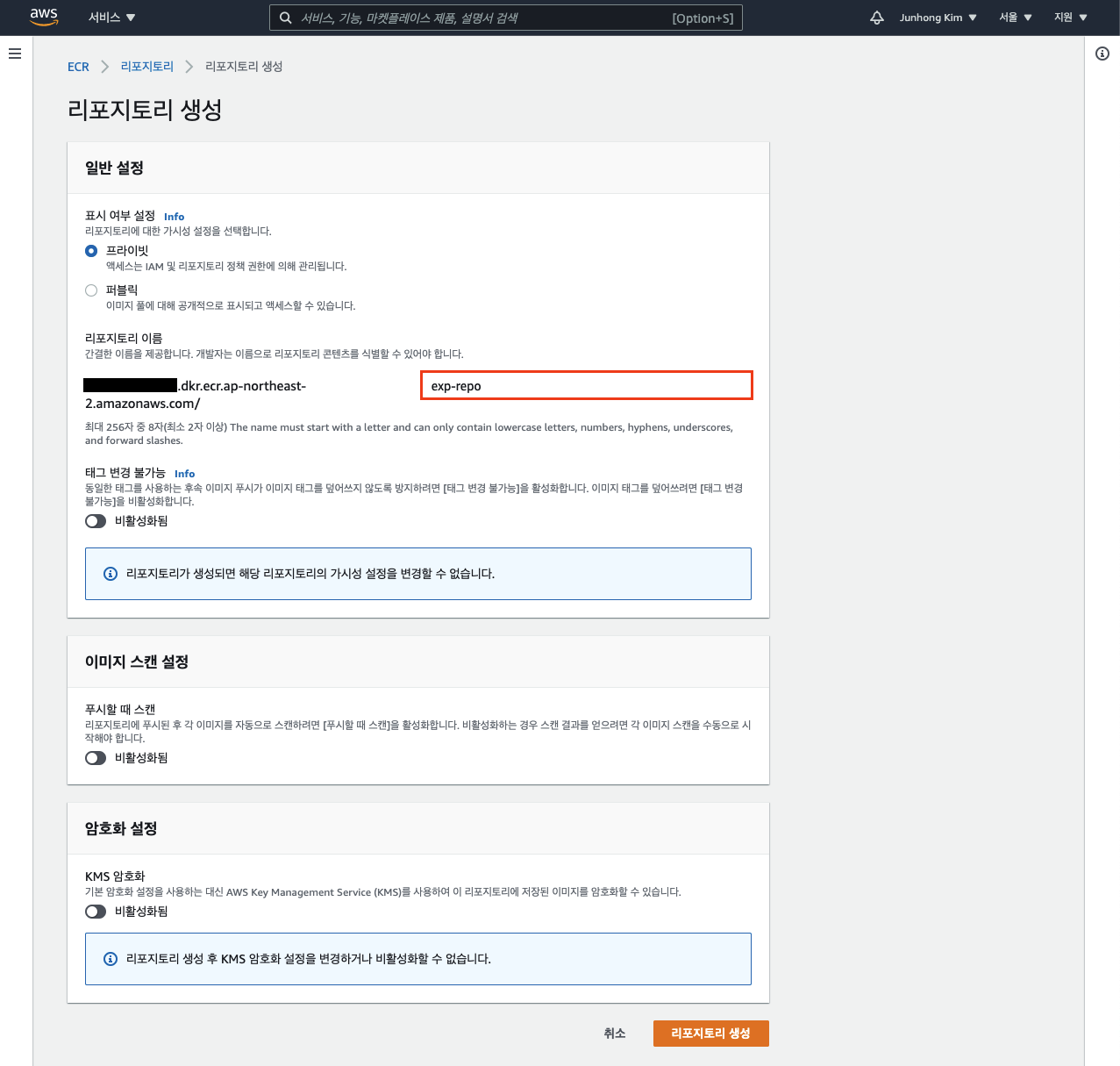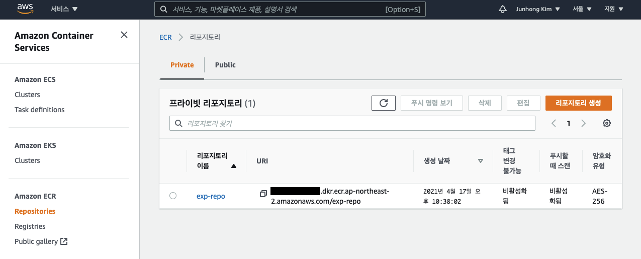 AWS ECR 서비스로 이동해서 레포지토리를 생성해봅시다.