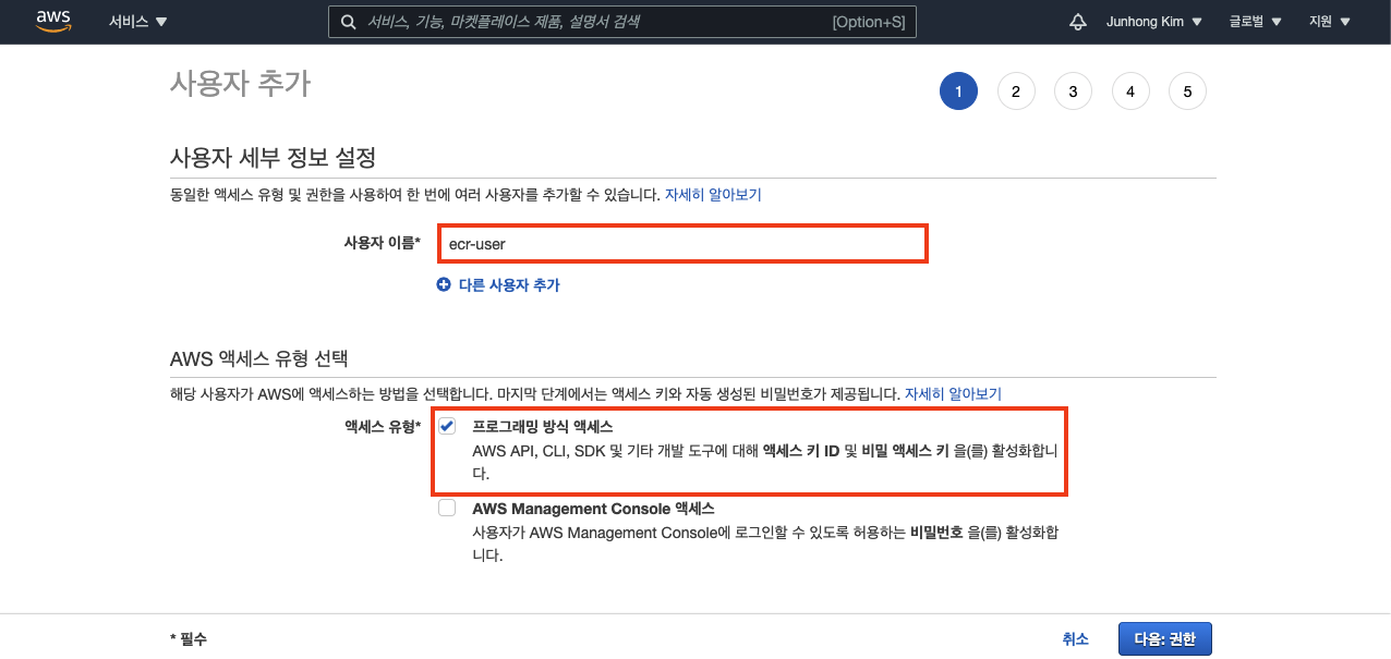 사용자 이름과 액세스 유형을 다음과 같이 선택해주세요.