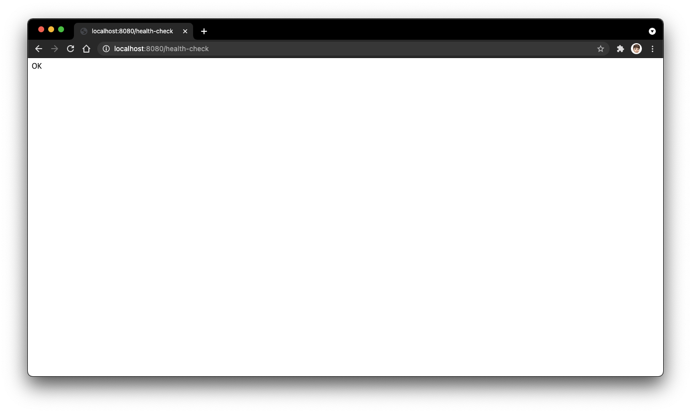 container를 실행한 뒤, 처음에 만든 healthCheck API를 호출하여 정상 실행되었는지 확인해봅니다.
