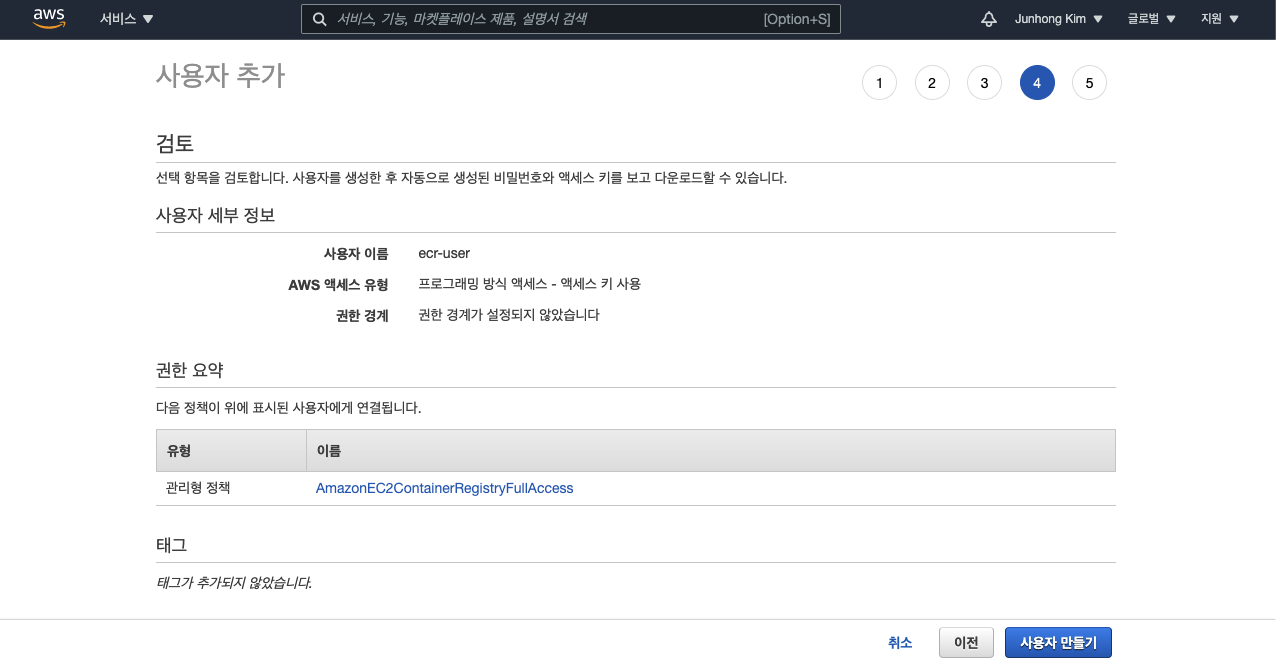 사용자가 사용할 권한을 추가해주세요, 여기서는 AmazonEC2ContainerRegistryFullAccess를 권한을 추가합니다.