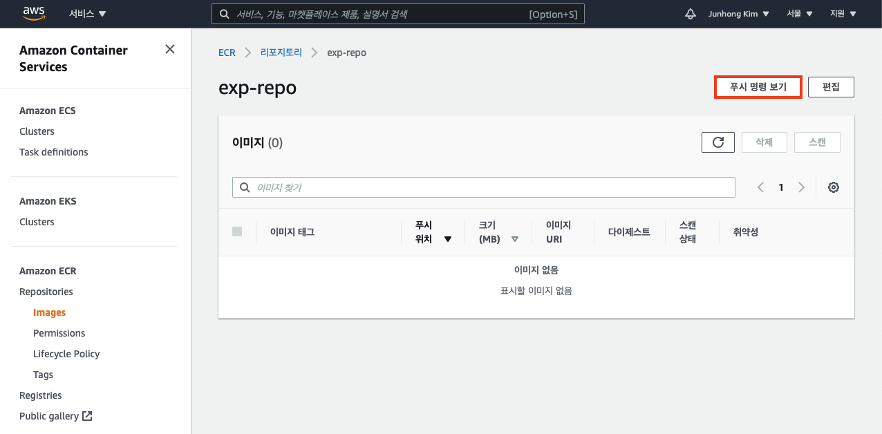 다시 AWS ECR 페이지로 돌아가서, 아까 생성한 exp-repo를 선택하여 푸시 명령 보기 버튼을 클릭합니다.