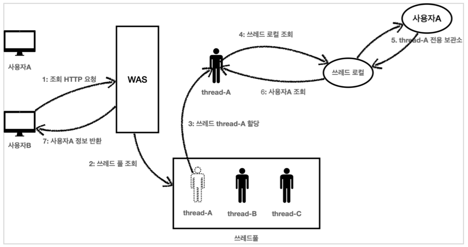 이러한 문제점을 해결하기 위해서 스레드 로컬(Java에서는 java.lang.ThreadLocal 클래스를 제공)을 사용하는 것을 고려해볼 수 있습니다. 스레드 로컬(Thread Local)이란 각 스레드마다 별도의 내부 저장소를 제공하여 해당 스레드에서만 접근할 수 있는 특별한 저장소를 의미 합니다. 예를 들어, ThreadA가 특정 인스턴스의 필드에 저장한 `userA` 값은 ThreadA만 확인할 수 있고, ThreadB가 동일한 인스턴스의 필드에 저장한 `userB` 값은 ThreadB만 확인 할 수 있게 됩니다. 따라서 같은 인스턴스의 필드에 접근해도 스레드 로컬을 사용하면 이전과 같은 문제가 발생하지 않습니다.