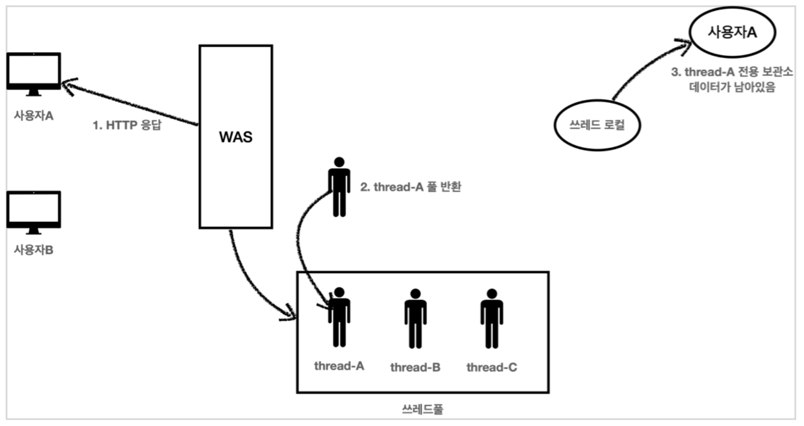 2. `사용자A`가 스레드 로컬을 사용한 후 `thread-A 전용 보관소`에 저장된 데이터를 제거하지 않고 스레드 풀에 반환합니다.