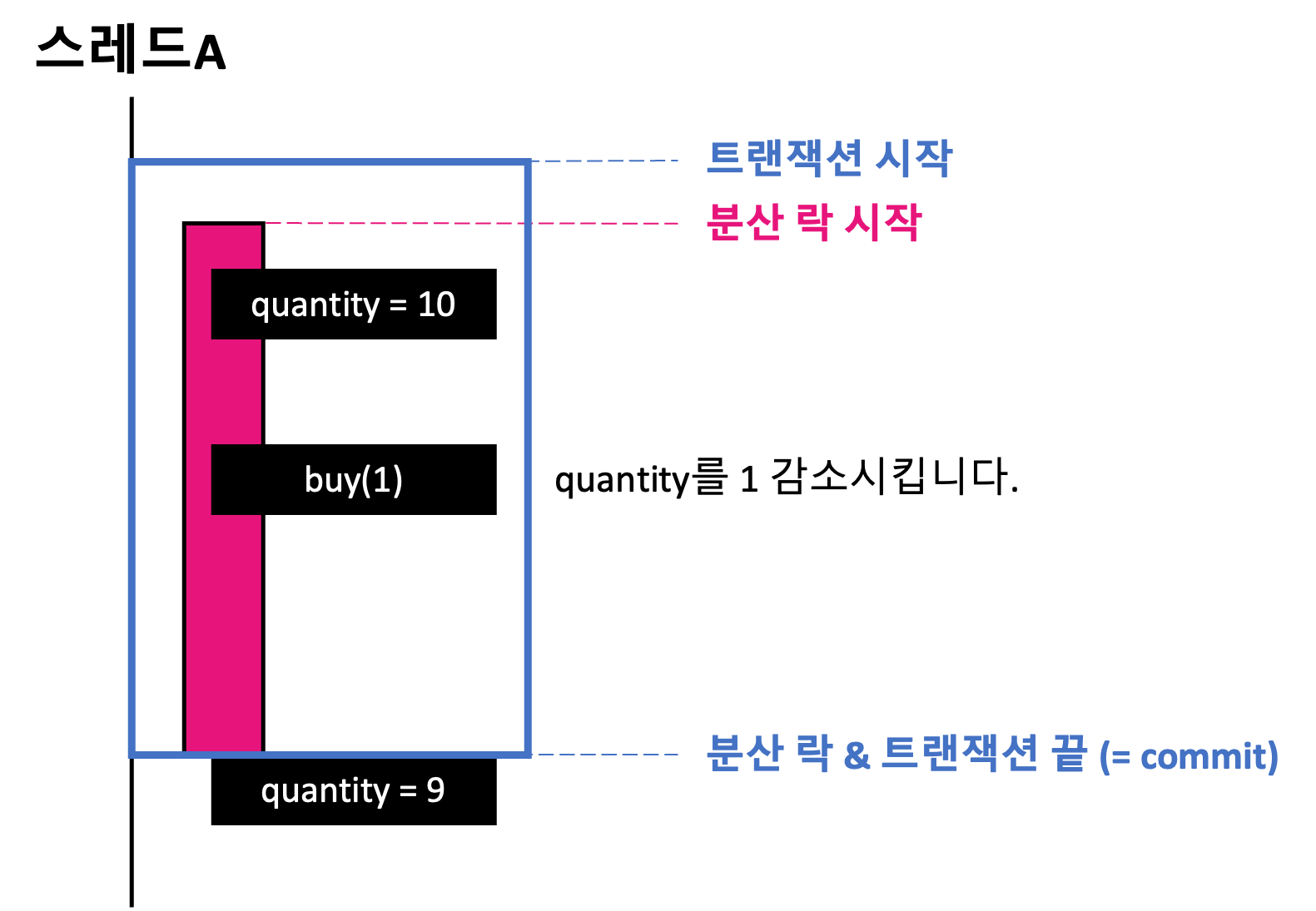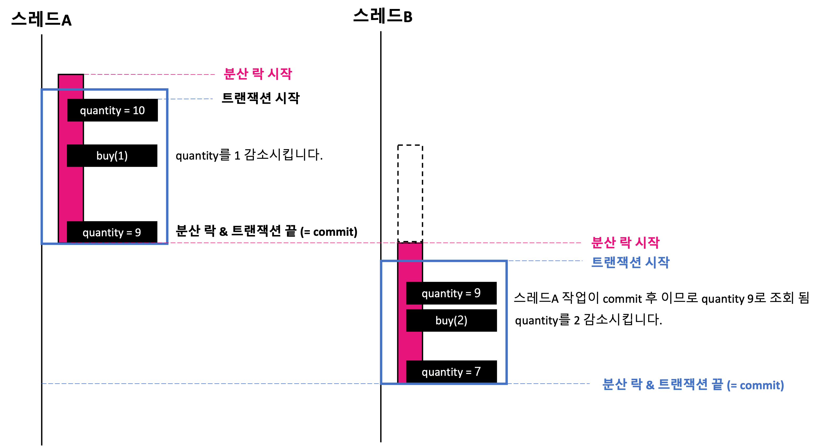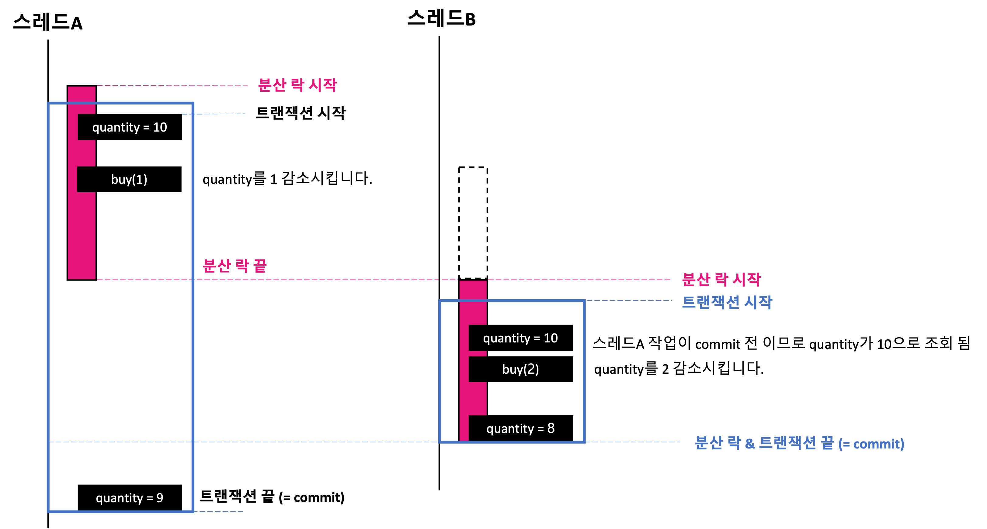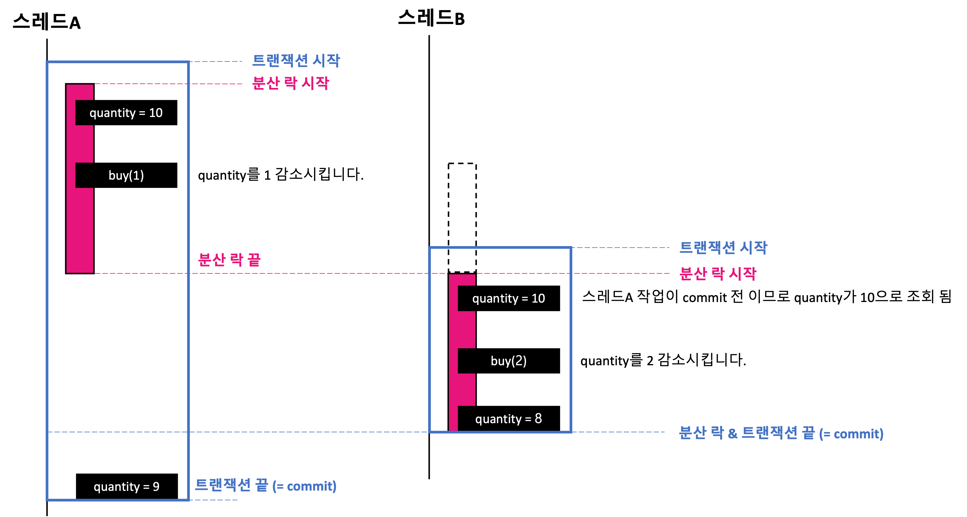 스레드A에 대한 처리하는 도중 분산 락이 풀리면서 스레드B가 대기하고 있다가 락을 획득합니다. 락을 획득하고 트랜잭션 내부에서 quantity를 조회한 결과가 10으로 반환됩니다. 왜냐하면 스레드A가 분산 락을 먼저 획득하고 로직을 수행하고 있지만 트랜잭션 commit 이 되지 않았기 때문입니다.