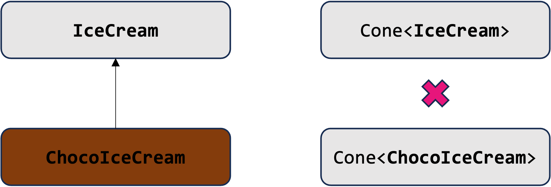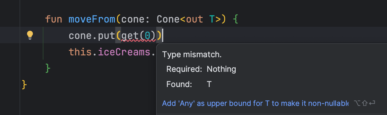 val iceCream: ChocoIceCream = cone.get(0) // Type mismatch.