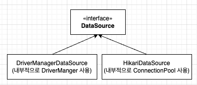 DataSource는 인터페이스 기반으로 구현체에 따라 다양한 방식(풀링, 분산, 로깅 등)의 Connection 관리가 가능합니다. Connection Pool을 이용하여 성능을 개선할 수 있으며, Connection 생성 로직이 추상화 되어 있어 DB 벤더에 독립적인 사용이 가능합니다. 일반적으로 Spring 환경에서는 DriverManager를 직접 쓰기보다는 DataSource를 통해 Connection을 획득합니다.